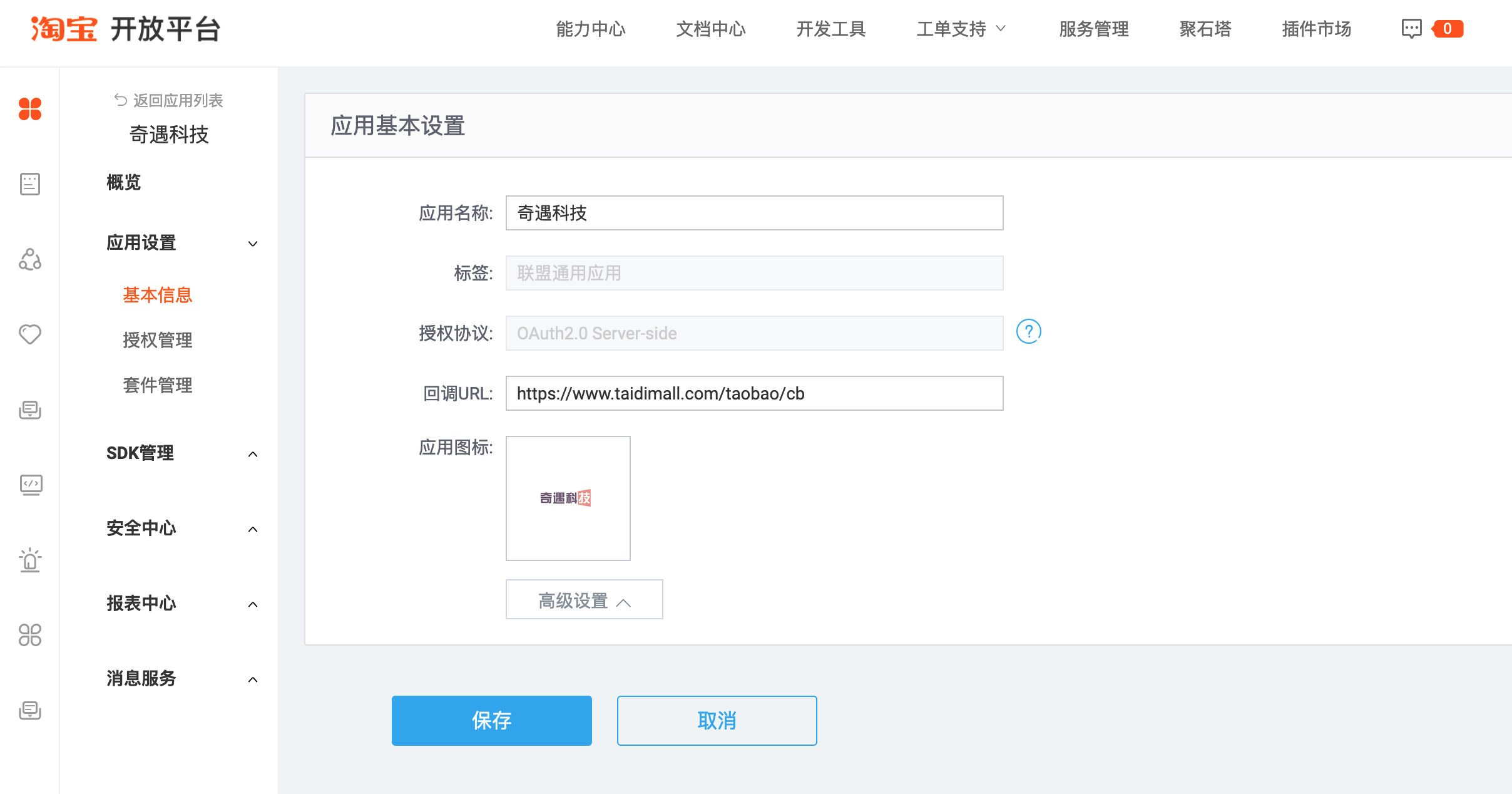 登录 淘宝开放平台 , 在应用管理里面找到您在 阿里百川 开发者中心创建的应用。