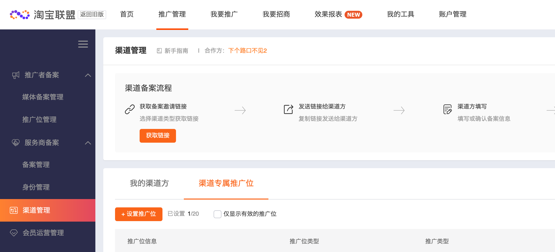 申请的是 渠道专属推广位 ,不是 推广者备案 中的 推广位管理 。