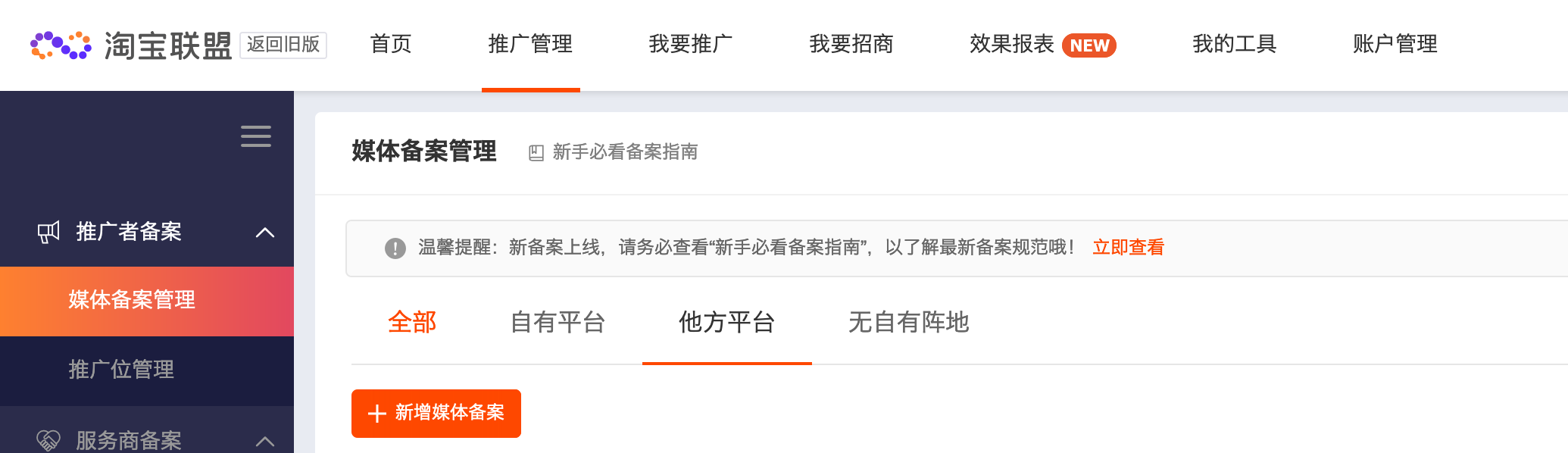 然后点击新增媒体备案添加一个新的媒体备案就可以了。