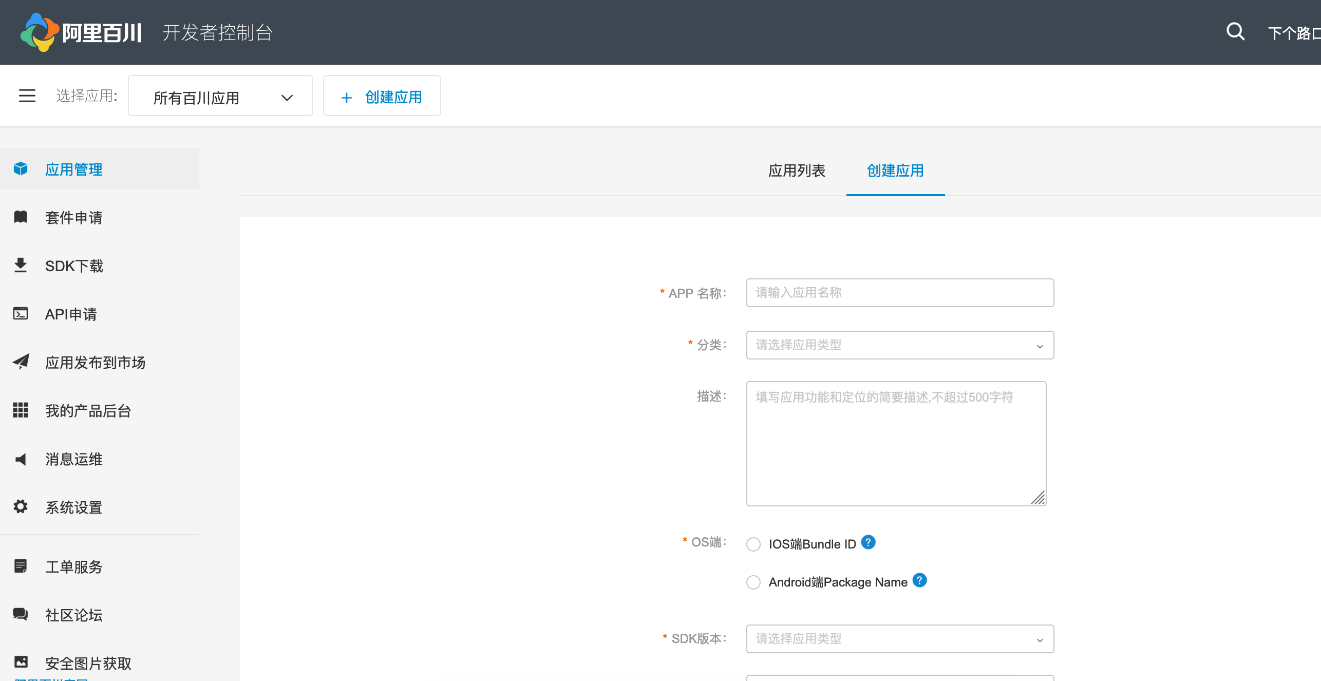 进入 套件申请 ,把允许申请的都申请了。 进入 我的产品后台 ,申请 百川电商SDK 。